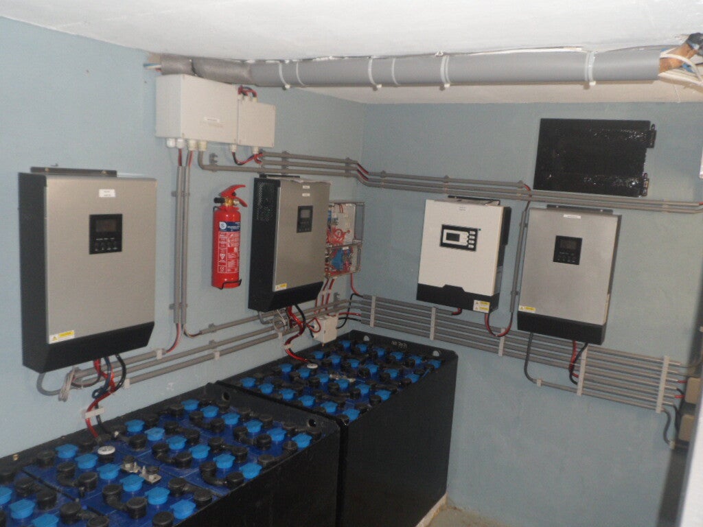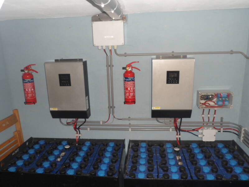 Onze zonnepanelen zijn niet traditioneel aangesloten maar, parallel en in serie. Dit om een zo'n hoog mogelijk rendement te verkrijgen. Sluit je alle panelen namelijk in serie aan en er zit een zwakke plek tussen dan levert het gehele systeem minder opbrengst. Bij een parallel aansluiting heb je hier geen last van. De stroom die we opwekken wordt opgeslagen in gebruikte heftruck batterijen. Deze batterijen staan op 48 volt. In totaal hebben we 3 heftruckbatterijen die een gezamenlijk vermogen van ongeveer 100 kWh kunnen opslaan.